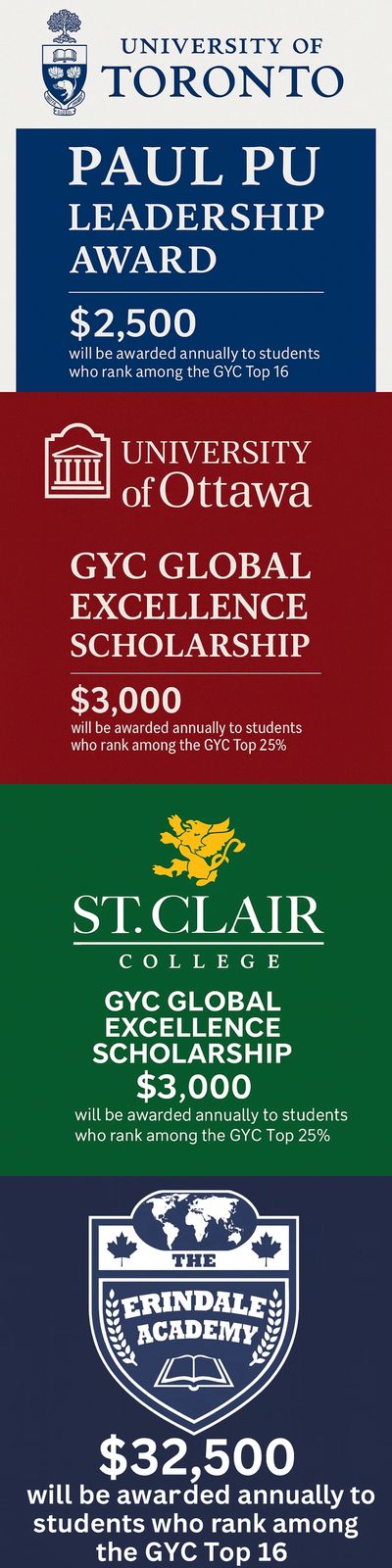 The University of Ottawa will provide a one-time $3,000 CAD entrance scholarship to up to four (4) of the top 25% of the winners of the GYC annual essay and speech competition.